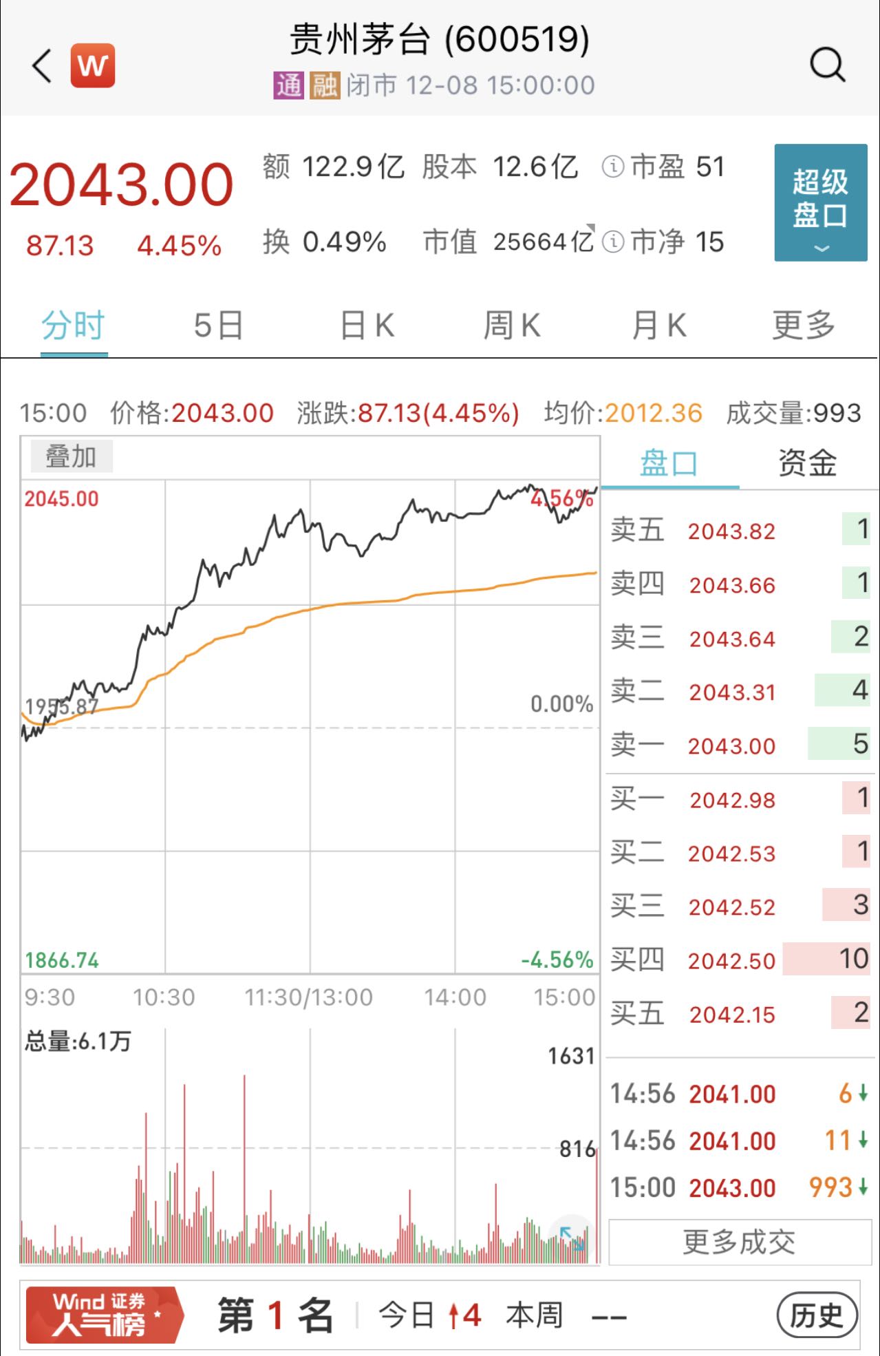 12月8日,沪深两市第一高价股贵州茅台高开高走,10时40分左右股价顺利站上2000元整数关口。午后股价始终维持强势走势,最终收报2043元/股,涨87.13元/股,涨幅为4.45%。