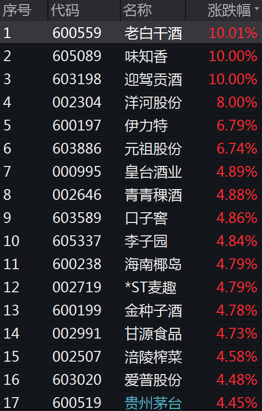 截至12月8日收盘,老白干酒(600559)、味知香(605089)、迎驾贡酒(603198)涨停,洋河股份(002304)、伊力特(600197)、元祖股份(603886)等涨超5%。
