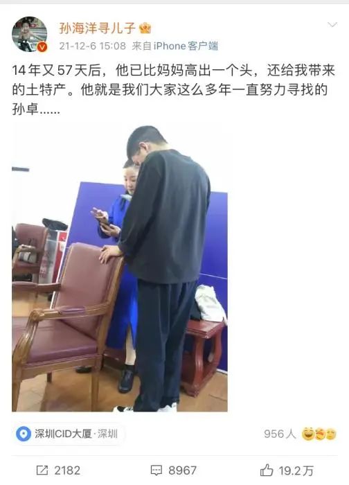 12月6日,公安部在广东省深圳市组织开展“团圆”行动认亲活动,为3组家庭实现团圆。历时14年又57天后,孙海洋找到了儿子。