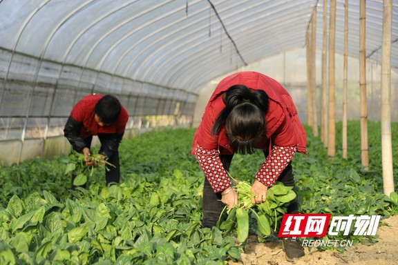 温室大棚内,工人们三三两两采摘新鲜菠菜。