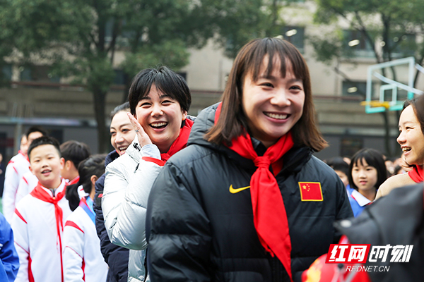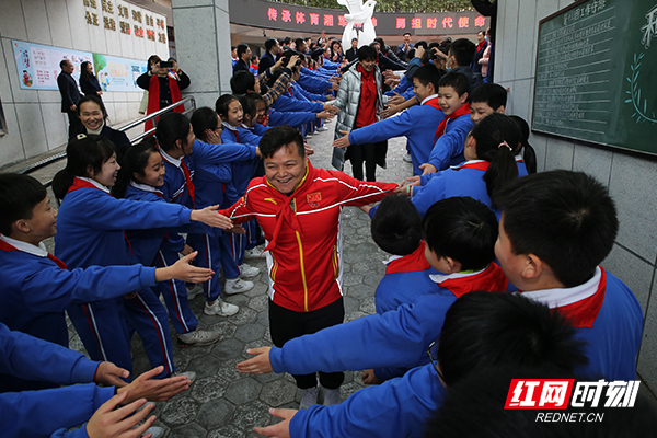 阳光透过浓密的树枝,照在大地上,给大地铺上了一件金色的大衣。我们学校举行了体育湘军进校园的活动。奥运冠军龙清泉、全运冠军孙文雁、黄瑰芬来到了我们的校园。