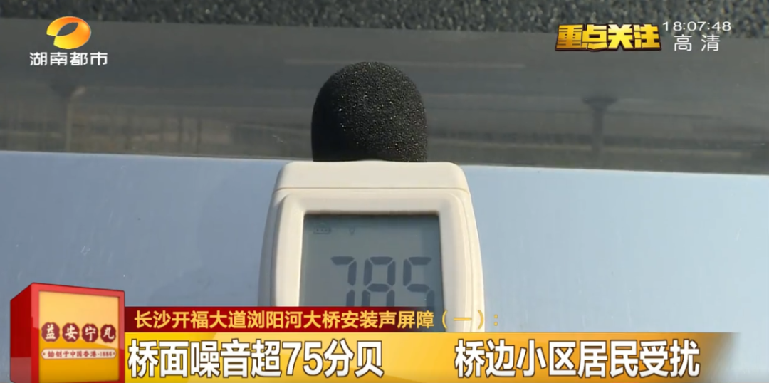 经过记者现场检测,大桥桥面噪音平均在75分贝左右,如果有大型车辆经过噪声可以达到85分贝以上。