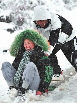 在湘西土家族苗族自治州花垣县,人们在雪中玩耍。新华社 图