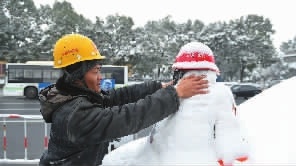12月27日,长沙市开福区湘江中路,一名穿着制服的工作人员堆起一个戴安全帽的小雪人。