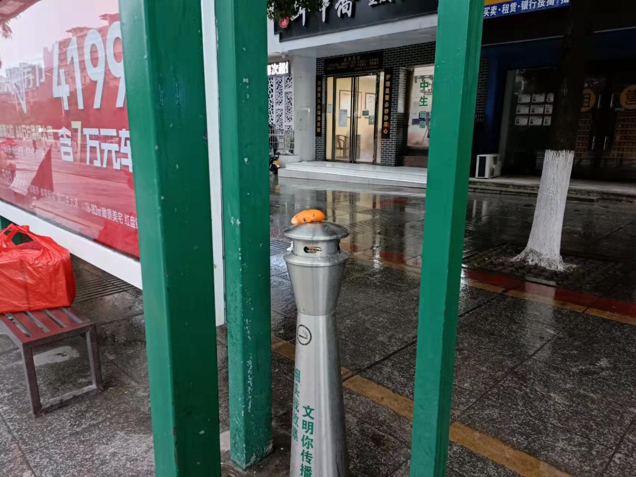 ▲敏州西路华夏田园公交车站垃圾随意扔在灭烟垃圾桶上
