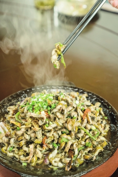 (汉寿西洞庭湖观鸟路线上有很多特色美食,其中以铁板芦鳝最为出名)