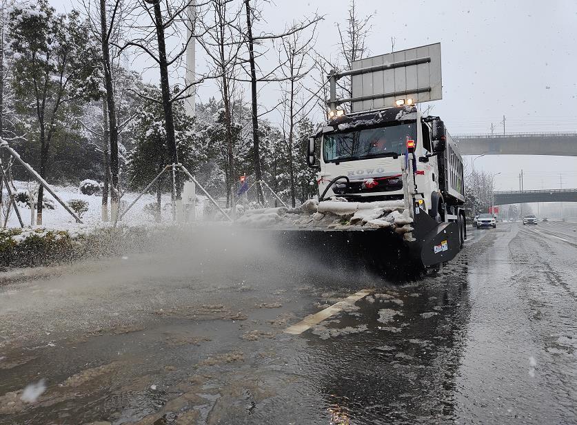 1月29日上午9时,记者在宁乡大道上看到一台大型除雪车。这台车可以说是一机多能,可以同时扫雪、推雪、撒布融雪剂,一旦上路,可以根据雪情和路况来切换模式进行除雪。