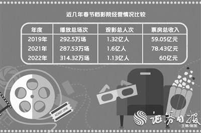 与之对比,2019年、2021年春节档(2020年春节档因疫情取消)的总票房收入分别为59.05亿元、78.43亿元;总观影人次分别为1.32亿人、1.6亿人;总播放场次分别为292.5万场、287.53万场。