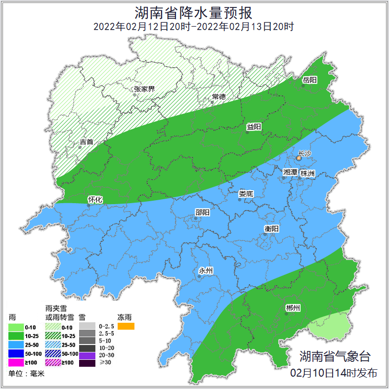 今天(2月10日)至13日,湖南降水再起,湘西北高海拔地区有雨夹雪或雪,局地有冻雨,其中12日晚至13日白天,湘中偏南部分大雨,13日晚自北向南天气逐渐好转。14日至15日大部地区多云天气为主,其中14日早晨湘中及以北有大雾。