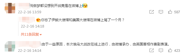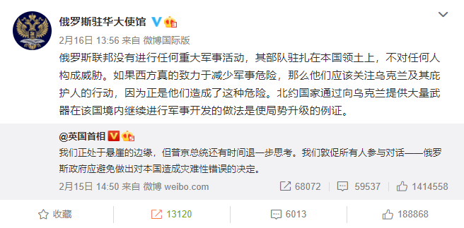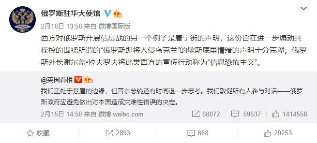 果然,到了第二天,@俄罗斯驻华大使馆 做出了回应。该账号转发了@英国首相 的帖文,并且连续做出两条回复。西方对俄罗斯开展信息战的另一个例子是唐宁街的声明,这份旨在进一步煽动其操控的围绕所谓的“俄罗斯即将入侵乌克兰”的歇斯底里情绪的声明十分荒谬。俄罗斯外长谢尔盖 拉夫罗夫将此类西方的宣传行动称为“信息恐怖主义”。