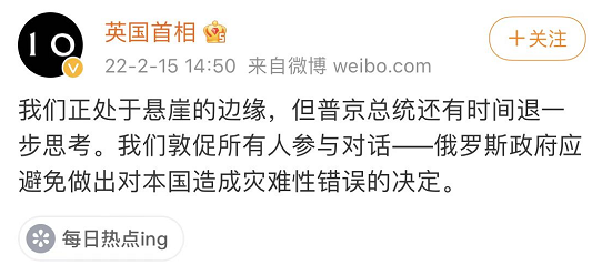 2月15日下午,沉寂了3个多月的微博账号@英国首相 突然发帖,就乌克兰局势喊话普京。据悉,该账号被认证为“英国首相鲍里斯·约翰逊”。我们正处于悬崖的边缘,但普京总统还有时间退一步思考。我们敦促所有人参与对话——俄罗斯政府应避免做出对本国造成灾难性错误的决定。