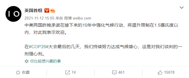 值得一提的是,@英国首相 账号上一次发文为2021年11月12日,内容和中美气候行动有关。