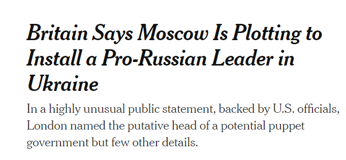 《纽约时报》援引英国外交部的声明称,有证据显示,俄罗斯正试图在入侵乌克兰后在基辅安插一名亲俄领导人。The British government said Saturday that the Kremlin was developing plans to install a pro-Russian leader in Ukraine — and had already chosen a potential candidate — as President Vladimir V. Putin weighs whether to order the Russian forces amassed on Ukraine’s border to attack.