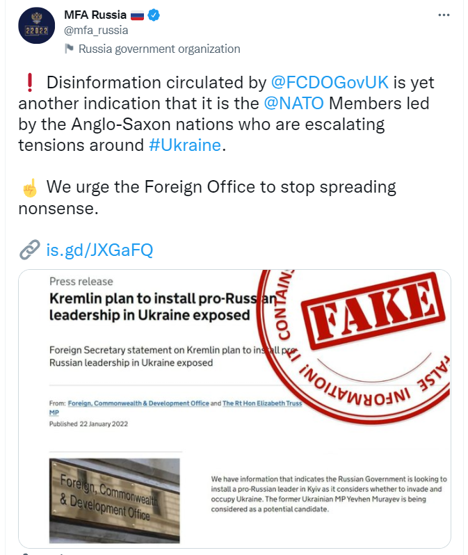 这一说法随后遭到俄罗斯的反驳,俄外交部在推特上发文表示:“英国外交部散布的虚假信息是另一个证据,表明正是由以盎格鲁-撒克逊人为首的北约,让乌克兰的紧张局势升级。”