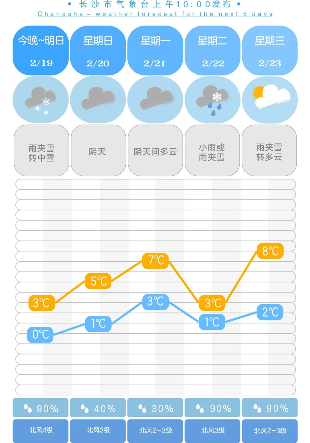 后天8时至21日8时,永州南部、郴州、衡阳南部、株洲南部阴天有中雨,怀化中南部、邵阳、永州北部、衡阳北部、株洲中北部、娄底、湘潭阴天有雨夹雪或小到中雪,其他地区阴天到多云;北风2~3级;最高气温4~6℃;最低气温1~3℃。