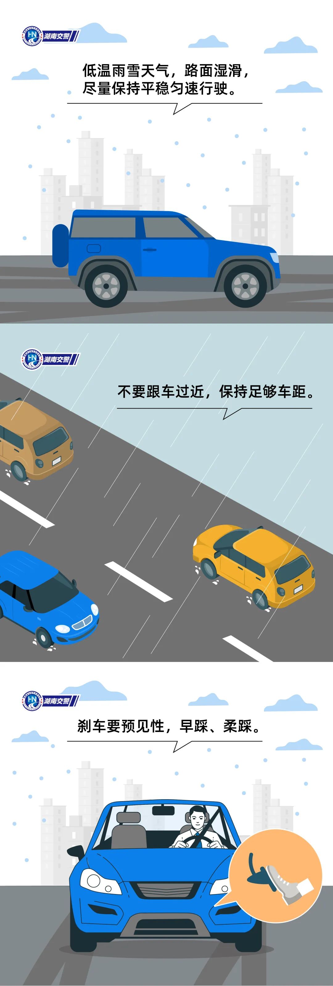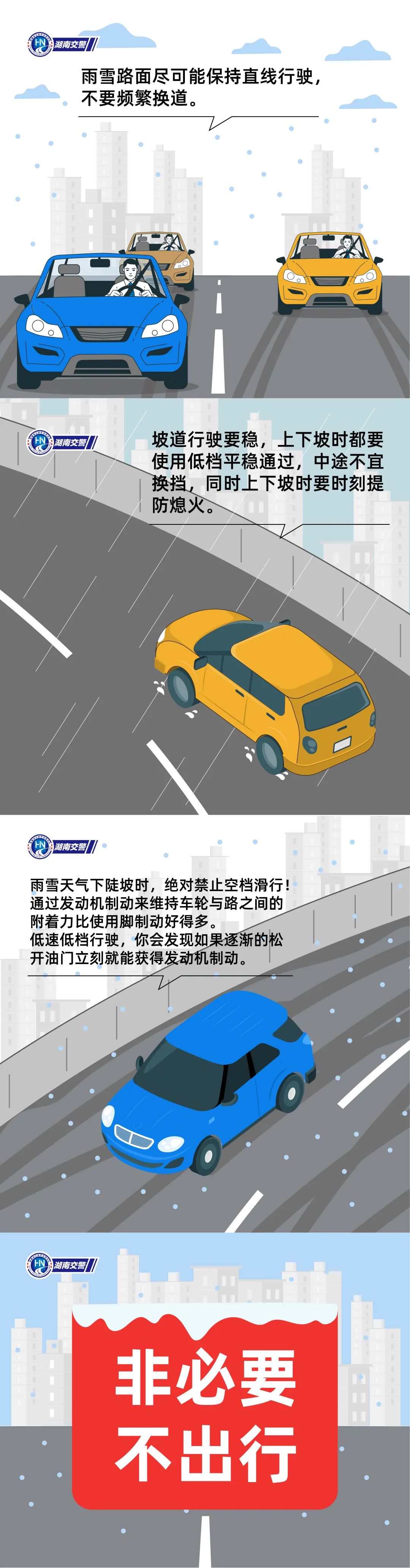 驾驶员需注意防范阴雨(雪)、冻雨造成的道路湿滑(结冰)、积雪及低能见度等对交通出行的影响。