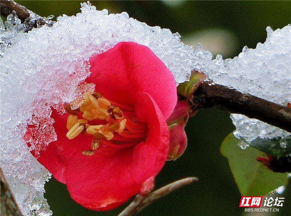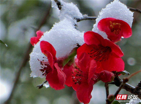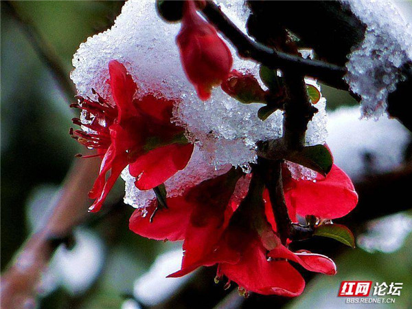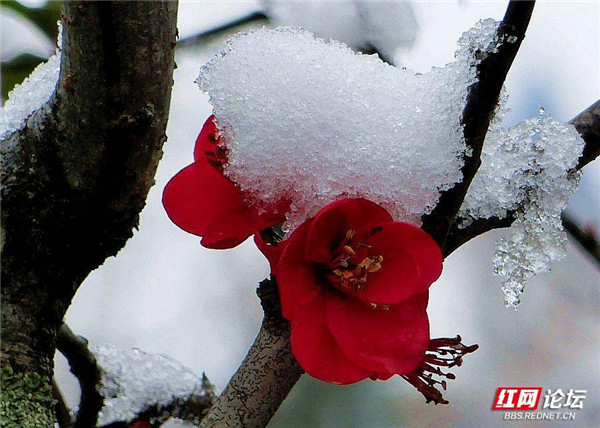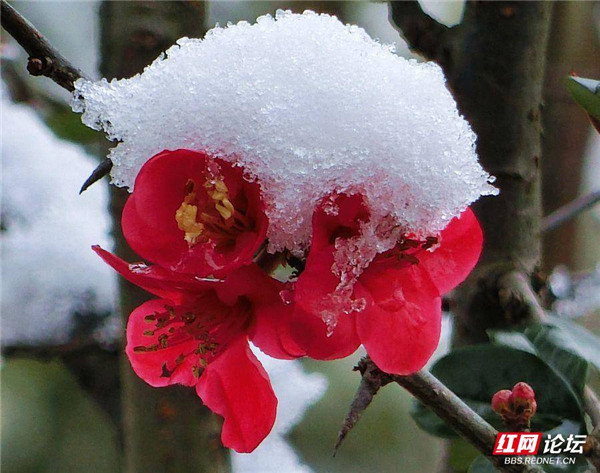 贴梗海棠,通常都会在3到5月之间绽放,想不到常德丁玲公园这几株海棠在2月就迫不及待地绽放了,恰巧还遭遇到了这几日的春雪。两个很难碰面的美好事物,在这几日机缘巧合地“同框了”,春雪的晶莹纯白与海棠的娇艳嫣红交相辉映。这“一树春雪压海棠”的奇景,让人叹为观止。