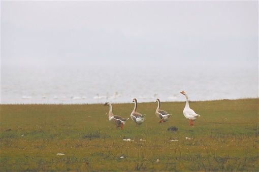 荠花榆荚深村里,亦道春风为我来。滩涂之上,野生小黄花点缀其中;水面上,家鹅粗犷的鸣叫声、小天鹅悦耳的欢歌声错杂交织,乘着春风逐渐飘远……