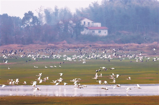 上图:黄盖湖保护区,候鸟振翅飞翔。张诚高 摄