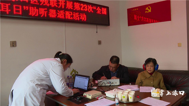 早上9点, 区残联工作人员为前来接受检测的听障群众端上热茶,并耐心告诉他们检测流程,教他们填写登记表,随后引导他们去听力专家的临时诊疗室检测听力,适配助听器。根据听障群众的听力情况,听力专家逐一进行验配,再从电脑反馈情况进行现场调试,直至语言清晰、无杂音为止。