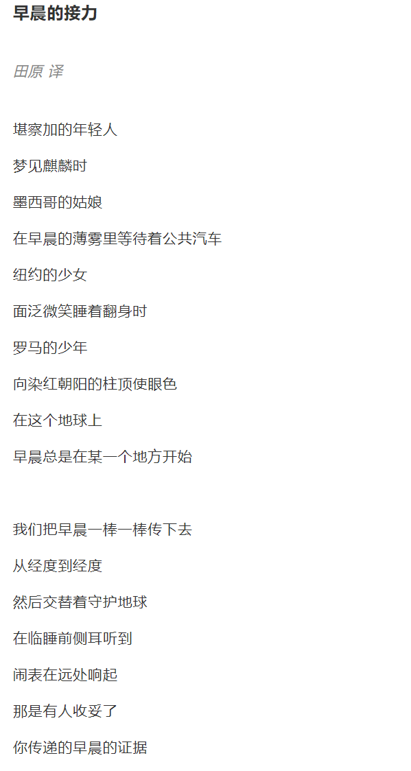品读这首诗需要充分发挥想象力。跟随着作者的想象,读者的脑海中仿佛浮现出一台转动的地球仪,它沿着地轴倾斜地转动,“从经度到经度”。诗的最后四行中,需要读者想象地球一侧的人在夜晚听到从地球另一端传来的早晨的闹铃声。