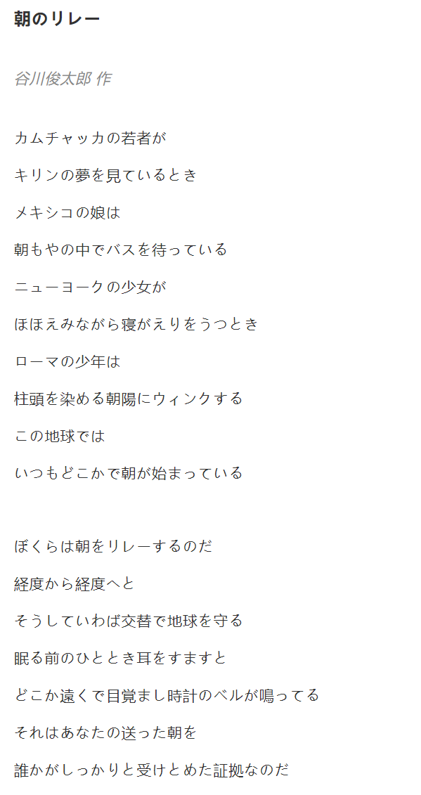 这首诗收录在谷川俊太郎的诗集《二十亿光年的孤独》中。题目《早晨的接力》中的“早晨”象征昼夜的交替,“接力”也有接续更迭的意思。将地球自转、晨昏交替的现象描述为“早晨的接力”,展现了作者崭新的视角和感性的思维。