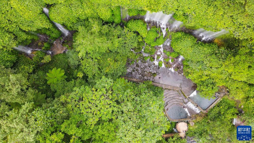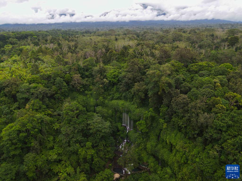 这是3月19日拍摄的掩映在热带雨林中的印度尼西亚龙目岛贝南科兰布瀑布(无人机照片)。