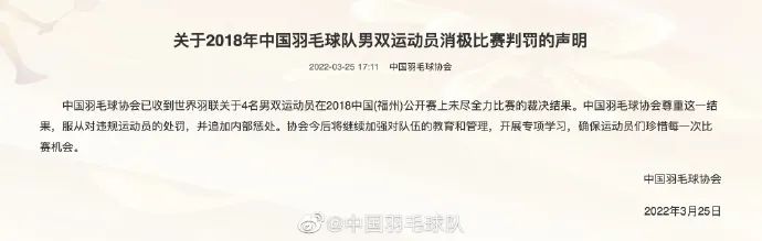 对此,中国羽毛球协会回应称:中国羽毛球协会已收到世界羽联关于4名男双运动员在2018中国(福州)公开赛上未尽全力比赛的裁决结果。中国羽毛球协会尊重这一结果,服从对违规运动员的处罚,并追加内部惩处。协会今后将继续加强对队伍的教育和管理,开展专项学习,确保运动员们珍惜每一次比赛机会。
