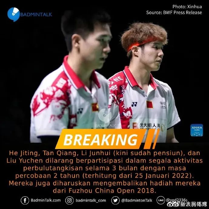 据世界羽联官网最新通告:国羽男双球员男双球员何济霆、谭强以及刘雨辰、李俊慧因为在2018年福州公开赛消极比赛,违反了世界羽联第3.1.2 条例,这四人将被禁赛3个月,缓期2年执行,处罚2022年1月25日生效,2024年1月25日至4月25日执行。