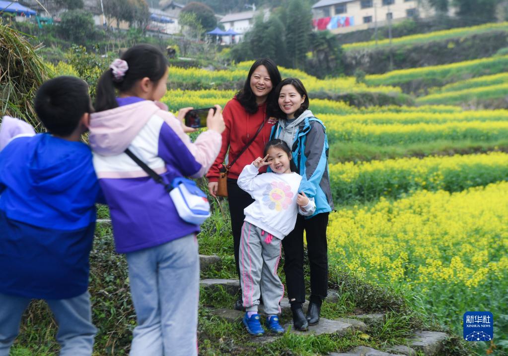 当日,浙江省建德市乾潭镇胥岭村开启首届“花朝节”,市民和游客在胥岭村观赏油菜花,体验胥岭古道和“花朝市集”。