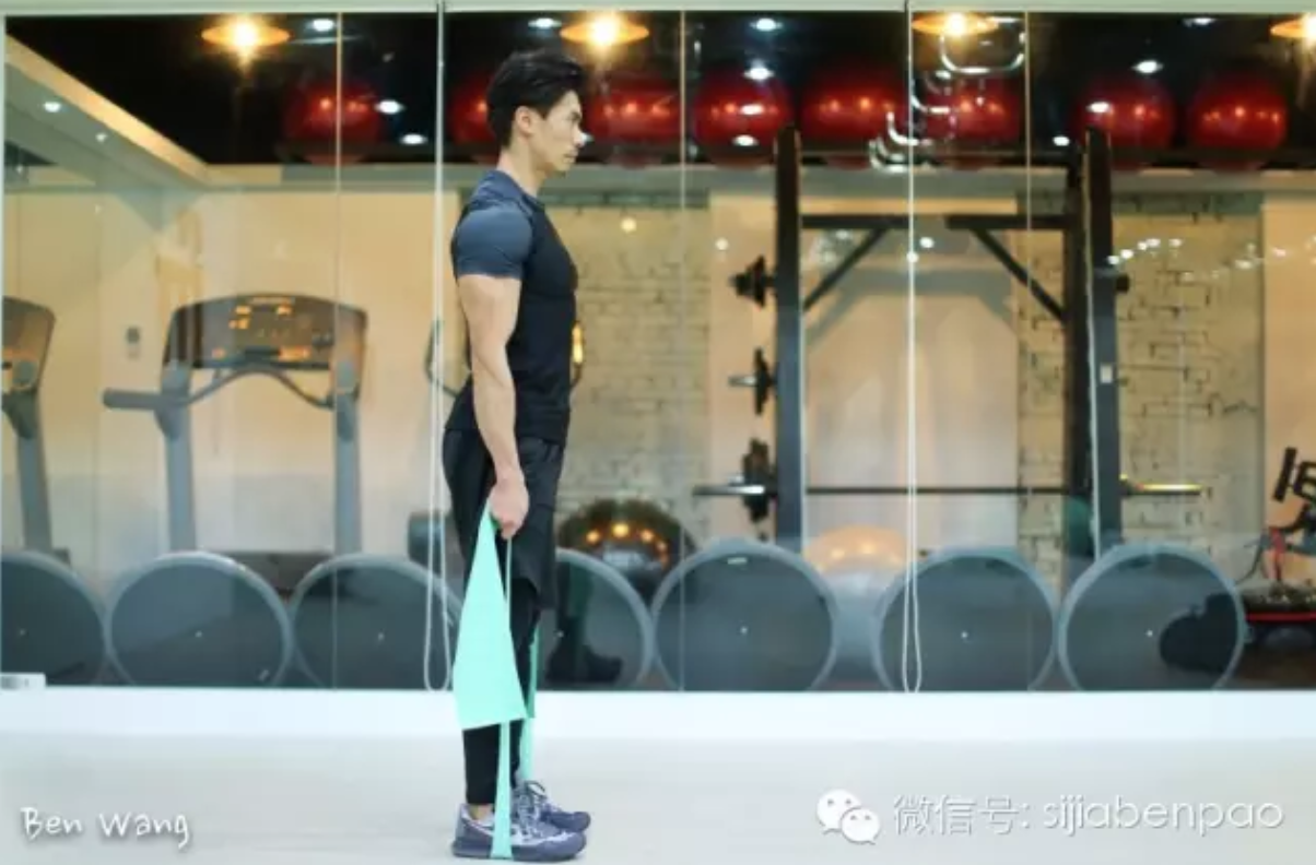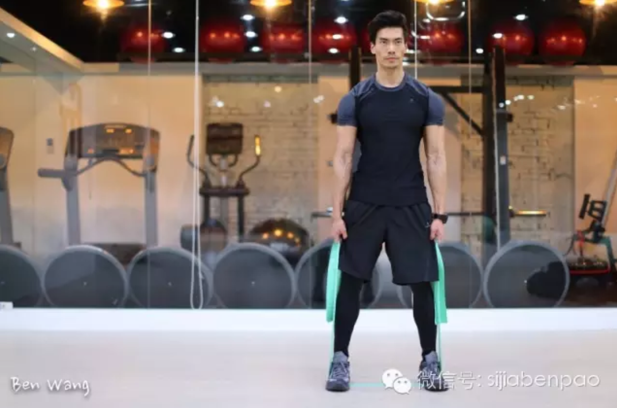 训练方式:膝盖微弯,背部保持直挺;双手抓住弹力带两端,决定合适的张力。