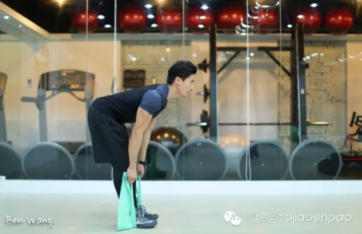 许多人都知道的硬拉动作,其实也可以用弹力带来训练,因为直接拿重量反而不好掌握,姿势容易变形。事实上,在练习深蹲之前,可以先从硬拉开始,练习用臀部正确发力,这样可以蹲得更好、确保姿势正确。