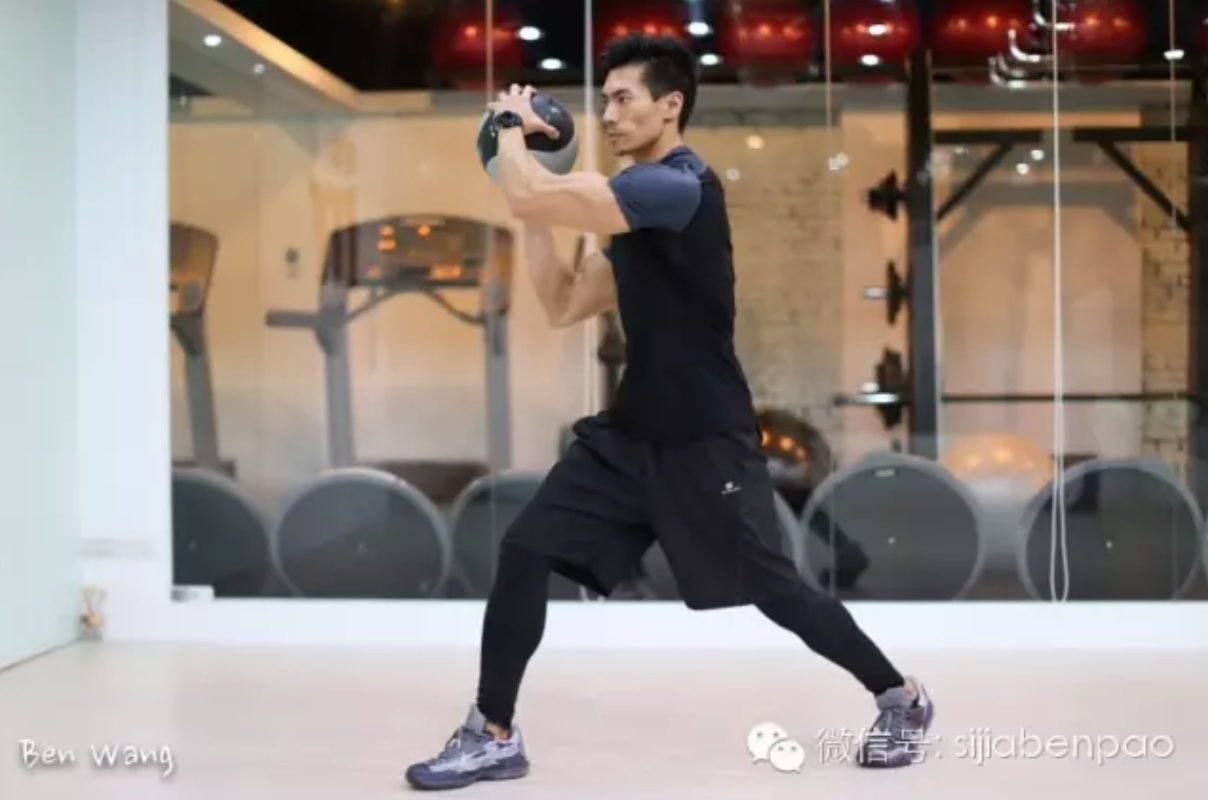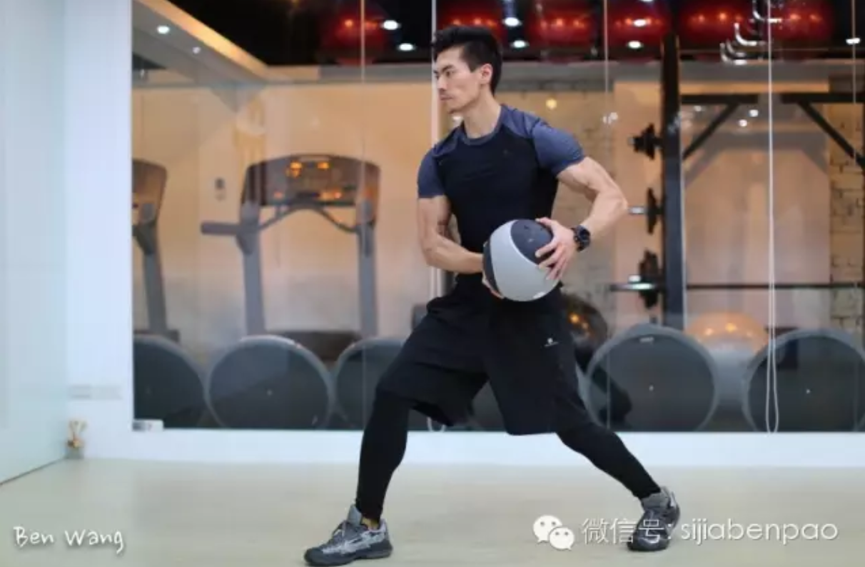 注意事项:训练过程中,身体核心需要对抗药球向外甩出的离心力,同时还可以训练到对跑步摆臂相当重要的手臂肌力。