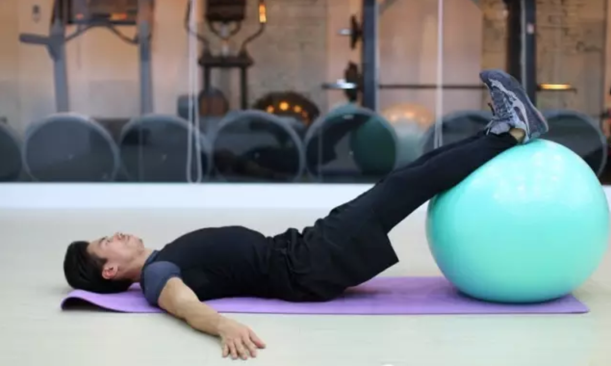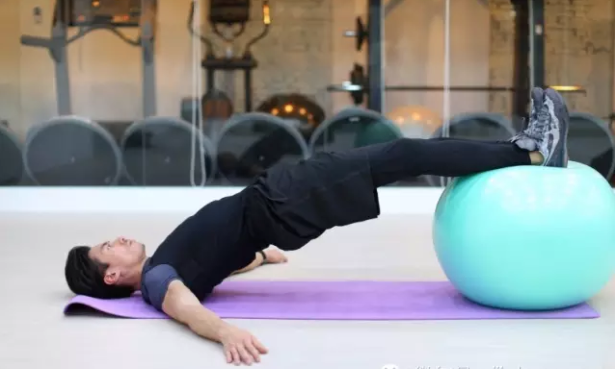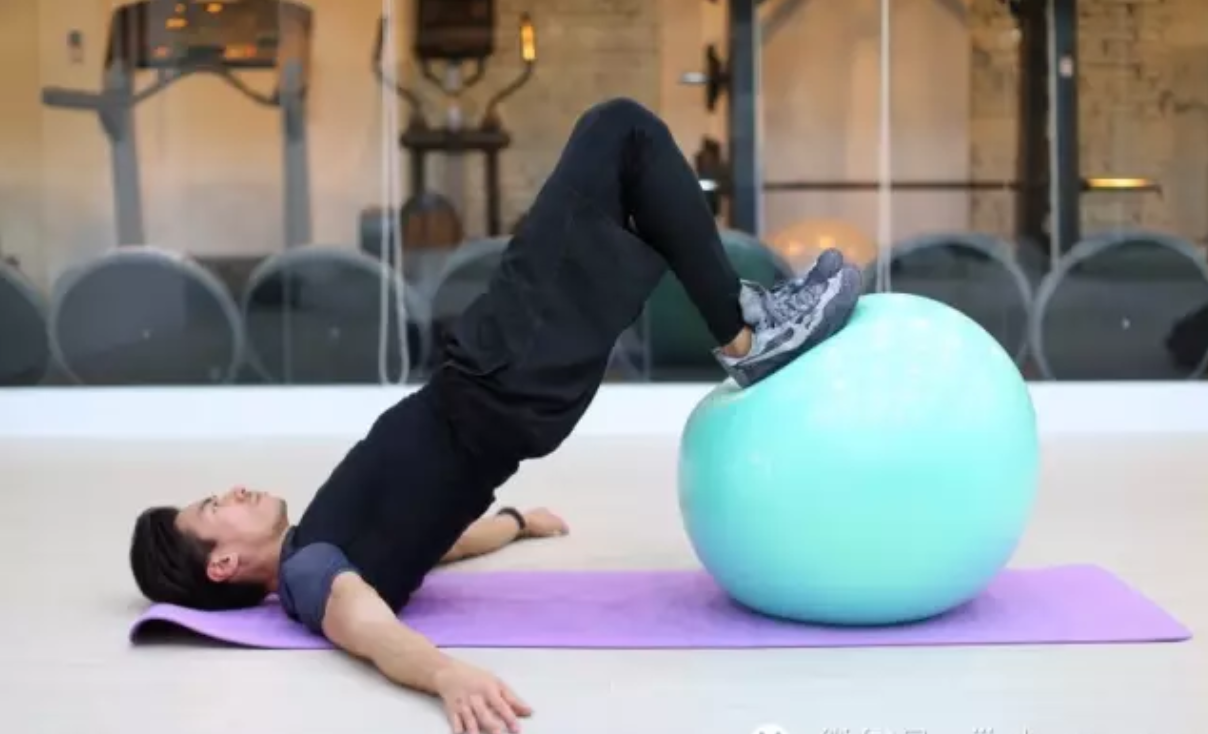 训练方式:将双脚置于抗力球上,以臀部、背部撑起身体。
