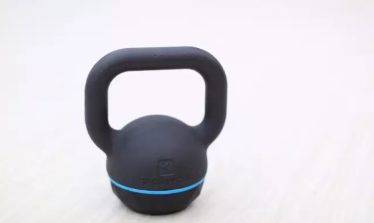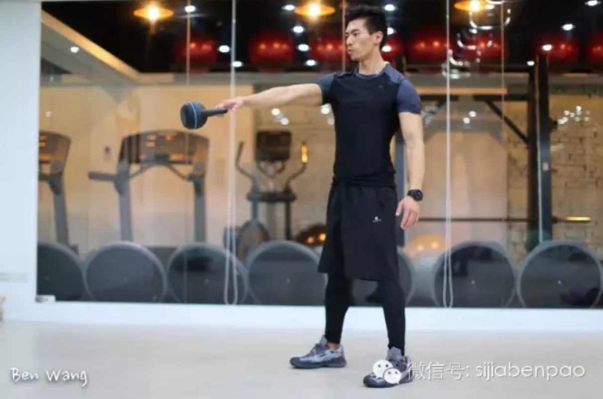 训练方式:髋关节带动向后座,保持挺胸,以臀部向前顶出的力量带动壶铃摆动。