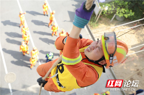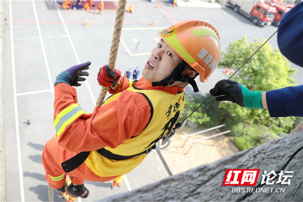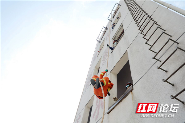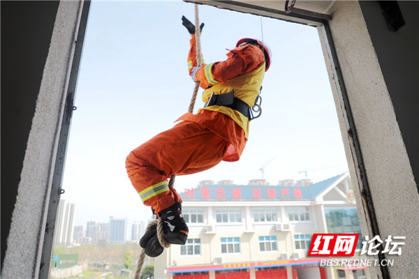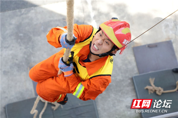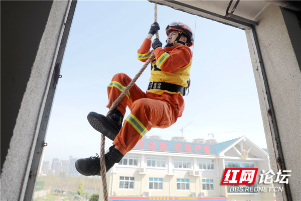 4月6日,湖南常德市消防救援支队的消防员利用绳索攀爬进入15米高的模拟训练塔,消防员身手敏捷,如同空中飞人。当日,常德市消防救援人员掀起春季大练兵活动高潮,先后进行了绳索攀爬、百米负重跑、单双杠等体能和技能的训练。