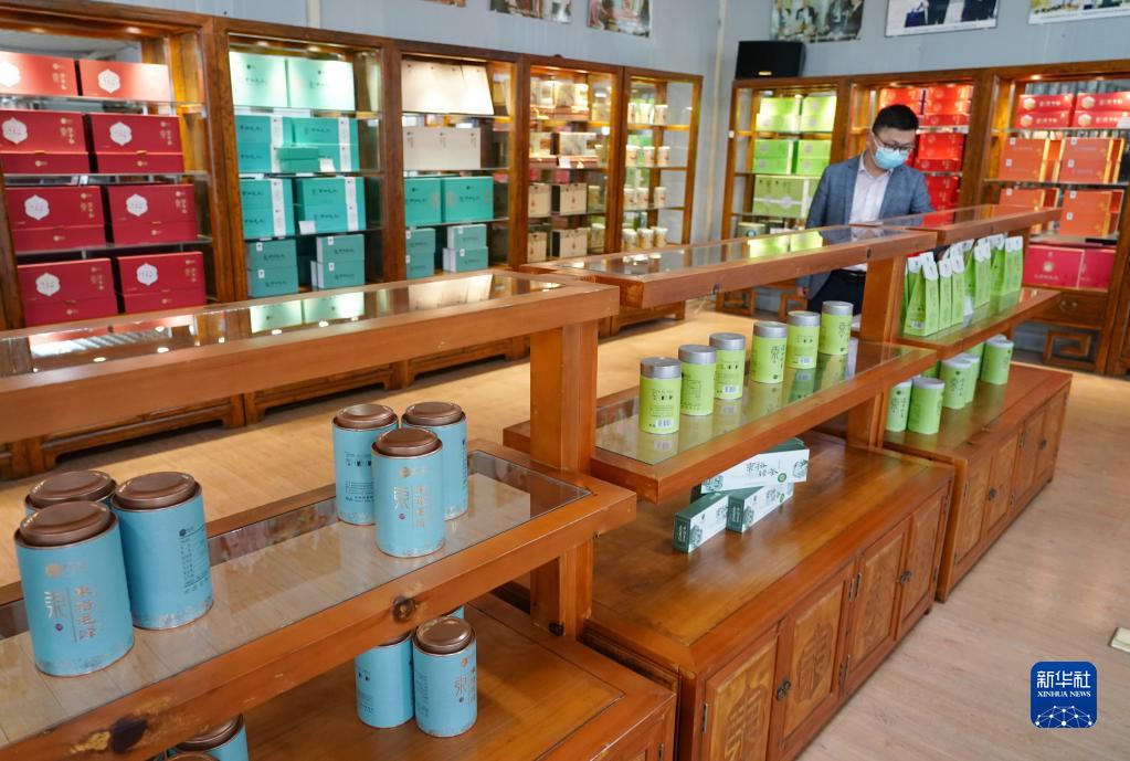 西乡县城北街道一家茶企展示厅内展示的茶叶产品(4月15日摄)。