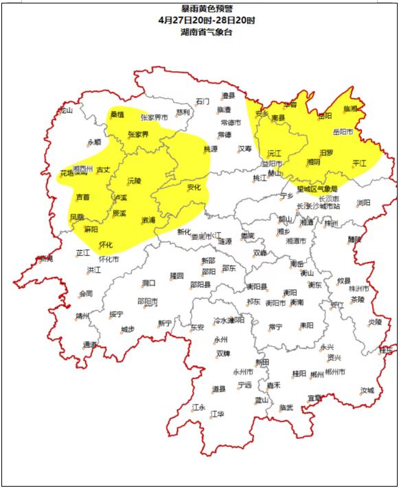 湖南省气象台今日16时发布暴雨黄色预警:预计27日20时至28日20时,长沙北部、岳阳、常德西南部、张家界南部、益阳、怀化北部、娄底西北部、湘西州部分地区将出现暴雨,局地大暴雨,并伴有短时强降水、雷雨大风等强对流天气,请加强防范。
