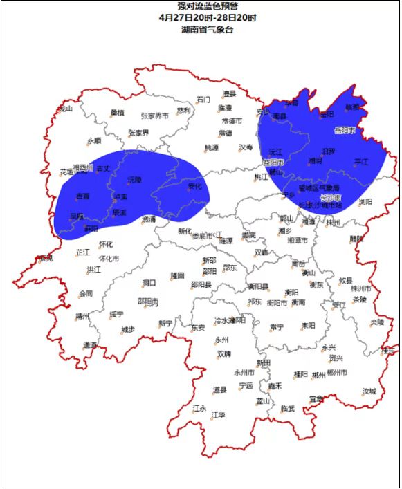 湖南省气象台同时发布强对流蓝色预警:预计27日20时至28日20时,长沙北部、岳阳、益阳、怀化北部、湘西州南部将出现8级至10级雷暴大风或冰雹天气,并伴有局地短时强降水,请加强防范。