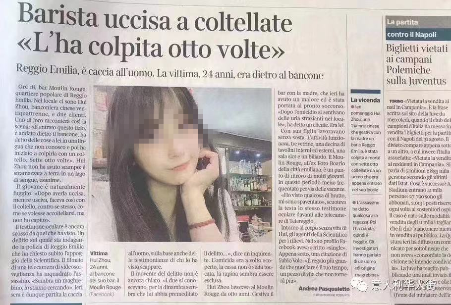 据意大利欧联网报道,当地时间2019年8月8日,意大利雷焦艾米利亚(Reggio Emilia)发生了一起重大凶杀案,一名24岁的华人女孩在酒吧打理生意时,突然闯入一名持刀男子,向毫无防范的华人女子发起攻击,华人女子身上多处受伤不治身亡。