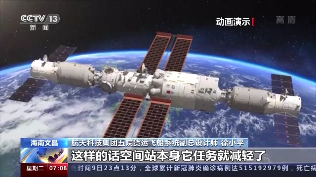 航天科技集团五院货运飞船系统副总设计师 徐小平:通过前期的天舟二、天舟三跟空间站在轨飞行的经验,我们可以为空间站做一些很大的支持工作。除了把货给运上去,我们还可以给空间站做一些,比如说轨道和姿态的控制工作,这样的话空间站本身任务就减轻了。