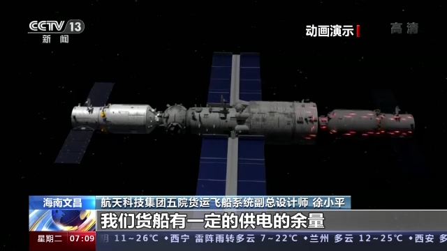 航天科技集团五院货运飞船系统副总设计师 徐小平:比如说供电能力,其实从前期飞行的结果来看,货船有一定的供电余量。我们把这部分的供电余量也贡献出来,然后把它并网到空间站,让空间站能够发挥更多的效益。比如说,更多的载荷可以开机,相当于效益就比较高了。