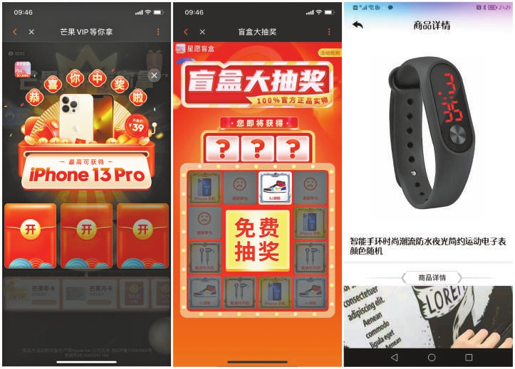 《中国消费者报》记者调查发现,芒果TV视频播放页面上基本都有抽奖广告,有的广告显示“VIP待领取”,有的显示“中奖啦!30天免费”。记者随机点击其中一个页面的抽奖广告,出现标题为“恭喜你中奖啦”的抽奖页面,页面中醒目位置是苹果手机图片,并标有“最高可获得iphone 13 Pro”字样,页面最下方是三个红包。记者随便点击其中一个,立刻弹出“iphone 13 Pro”“抽”字样,而其他两个未点击的红包显示“很遗憾 未中奖”,同时自动跳转至标题为“盲盒大抽奖100%官方正品实物”的抽奖页面,该页面中央是抽奖按钮,周围分布着12张图片,分别为3张iphone 13 Pro、3张ipad mini、3张AirPod(第三代)和3张“谢谢参与”,代表抽奖可能出现的4种情况。记者在该页面上点击抽奖按钮,手气依然不错,iphone 13 Pro图片被点亮,紧接着就弹出“恭喜获得盲盒”字样的弹窗页面。记者看到,奖品图片上方除了标有极大的“iphone 13 Pro”字样,左边同时标有字号极小的“最高开”字样,下方提示“请输入您的手机号码”。记者输入手机号码,点击“立即开奖”按钮,便进入支付39元页面,页面中央标有“开出苹果apple/苹果iphone 13 pro等豪礼盲盒”,支付39元后,页面上方提示“恭喜您抽中智能手环,已经放置在App仓库中”。记者点击页面下方的“点我下载星愿盲盒App提货”,随后打开“星愿盲盒App”,在“仓库”栏目下,记者看到了自己抽中的智能手环,除了标有“市场价¥199”外,没有任何生产信息和品牌标识。记者点击“回收”,显示“回收金额27.30本次回收额外送星币27个,回收星券只可用于盲盒开盒支付”。