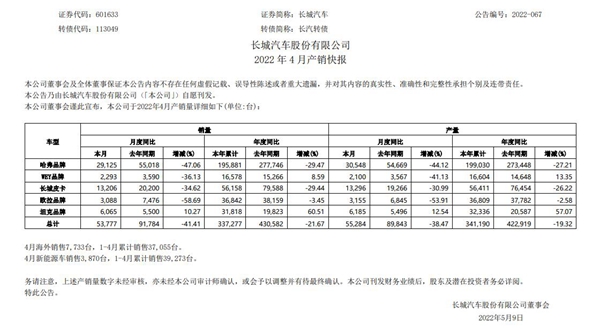 对此,长城汽车表示,销量的下滑主要是受国内疫情影响,供应链、物流等多方面受限,导致生产、销售均受到冲击。但长城汽车正积极与各方沟通,尽力解决问题,并预计5月将会明显改善。