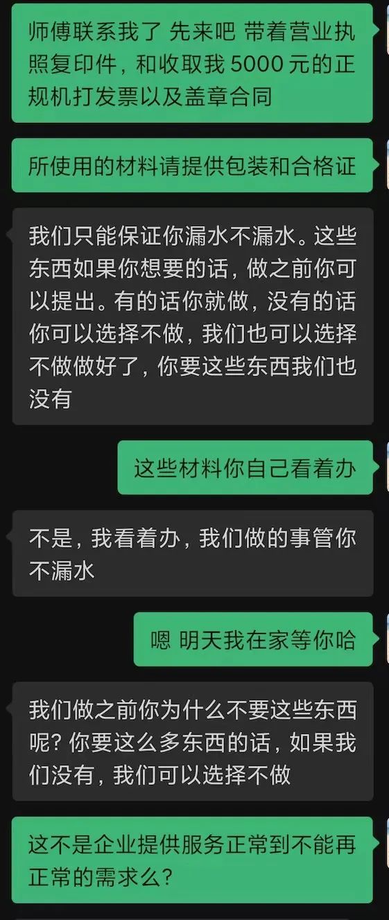 随后一位施工师傅打来电话,黄先生向其说明漏水情况。该师傅说可以做,不用拆瓷砖,往缝里打胶水就行,一个小时就能干。“我在电话里问他多少钱,他说要看过现场才知道,连胶水多少钱一斤都没说。”