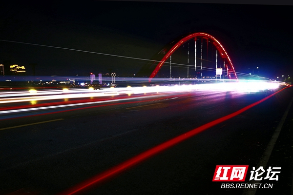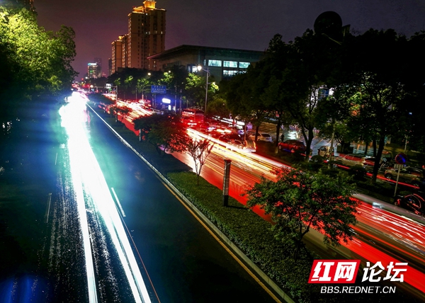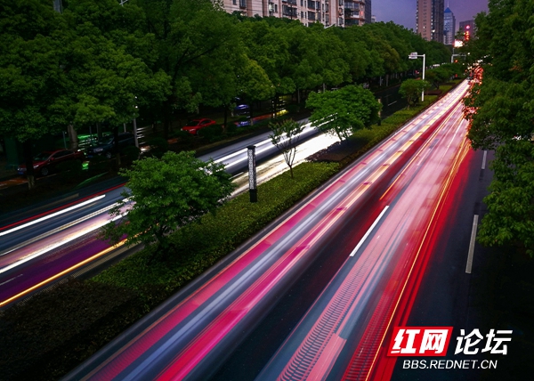 各色各样的光线给马路披上了颜色迥异的衣衫,平时颜色单一的道路也变得五彩斑斓起来,白日里平凡的两条马路变成了红白相间的两道光线,中间的隔离带就像是分割线一样,将红白两色严格分割开来。