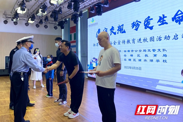 本次活动以“遵守交规,珍爱生命”为主题。现场,湘潭市交通安全宣讲员开展了交通安全主题宣讲课,向同学们出示了“注意非机动车”“注意儿童”等交通安全标志,并用视频的方式展现发生交通安全问题的真实案例,提醒同学们提高自身的交通安全防范意识,加强“一盔一带”(安全头盔、安全带)的自觉行为。课堂师生互动频繁,氛围活跃,群情激昂,获得了一致好评。现场还为“画笔绘交通”湘潭市交通安全创意绘画大赛进行了颁奖。
