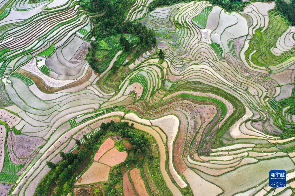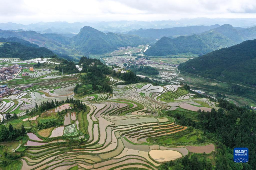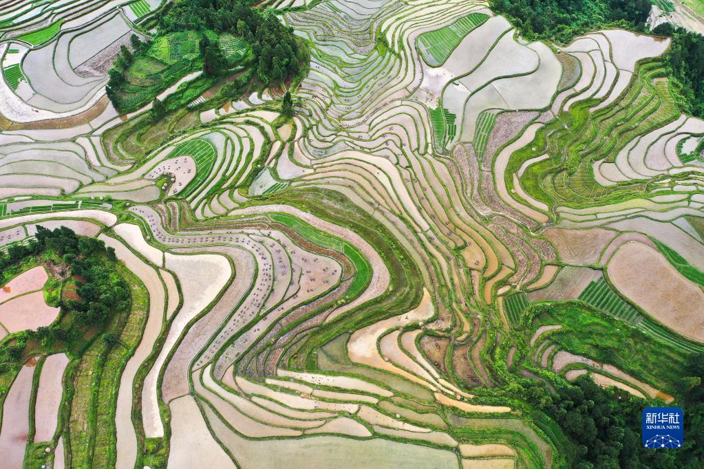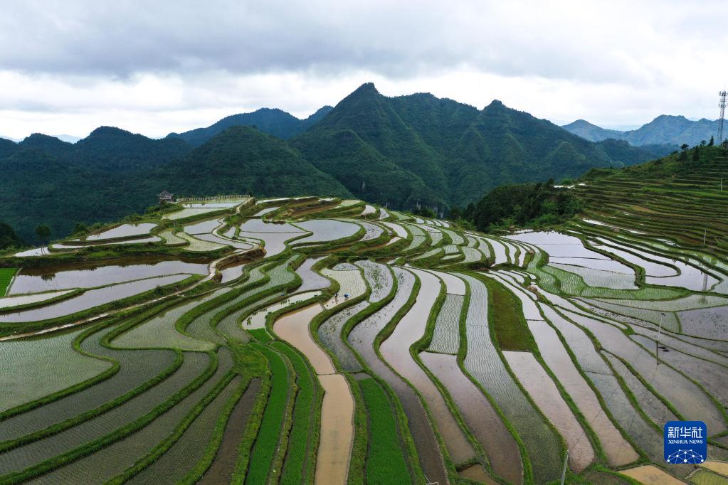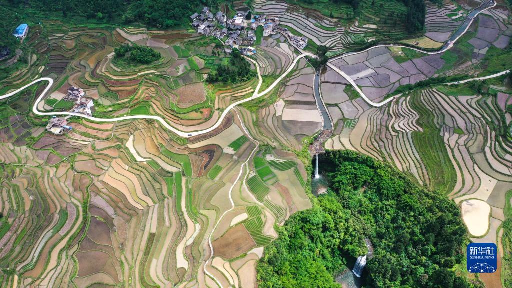 初夏时节,位于贵州省黔南布依族苗族自治州贵定县沿山镇石板村的腊利梯田蓄水丰盈,阡陌交错。青山环抱着梯田,瀑布点缀其间,风光旖旎,如诗如画。
