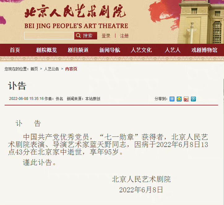 今天(6月8日)下午,“七一勋章”获得者,北京人民艺术剧院表演、导演艺术家蓝天野,因病在北京离世,享年95岁。