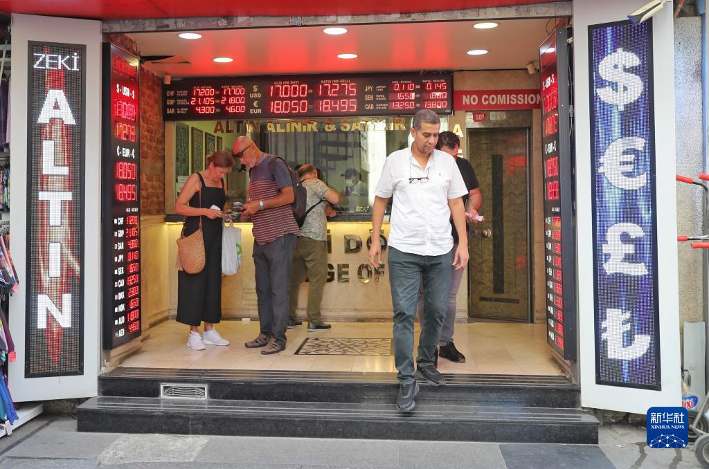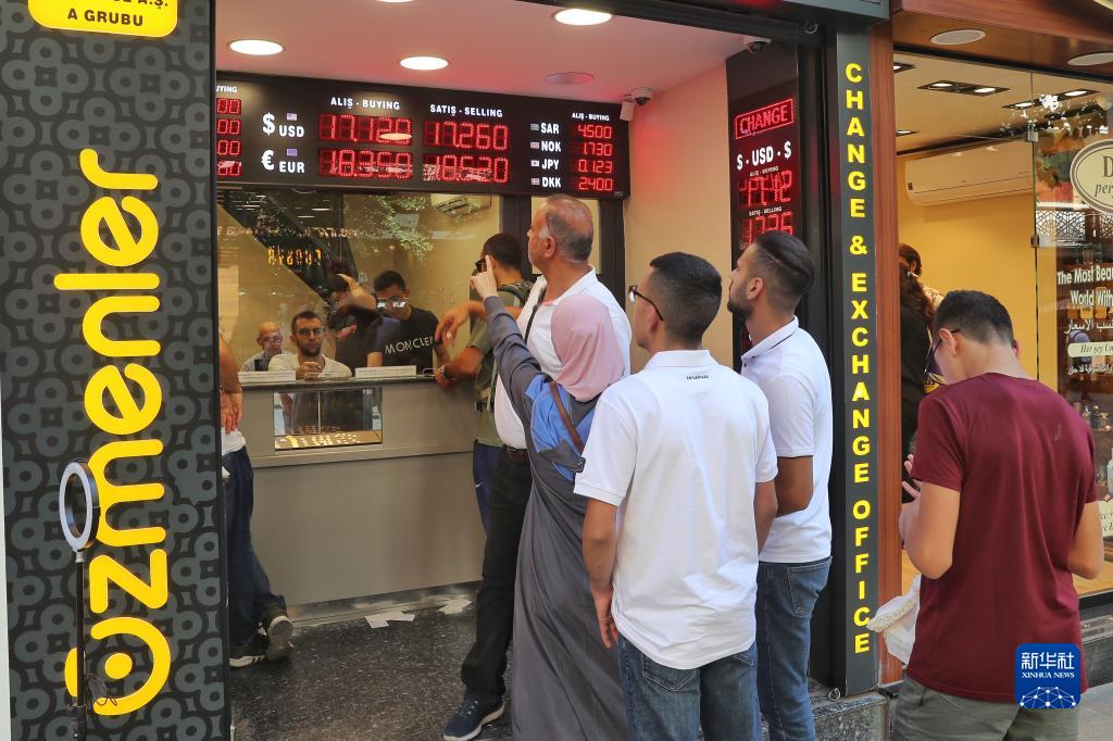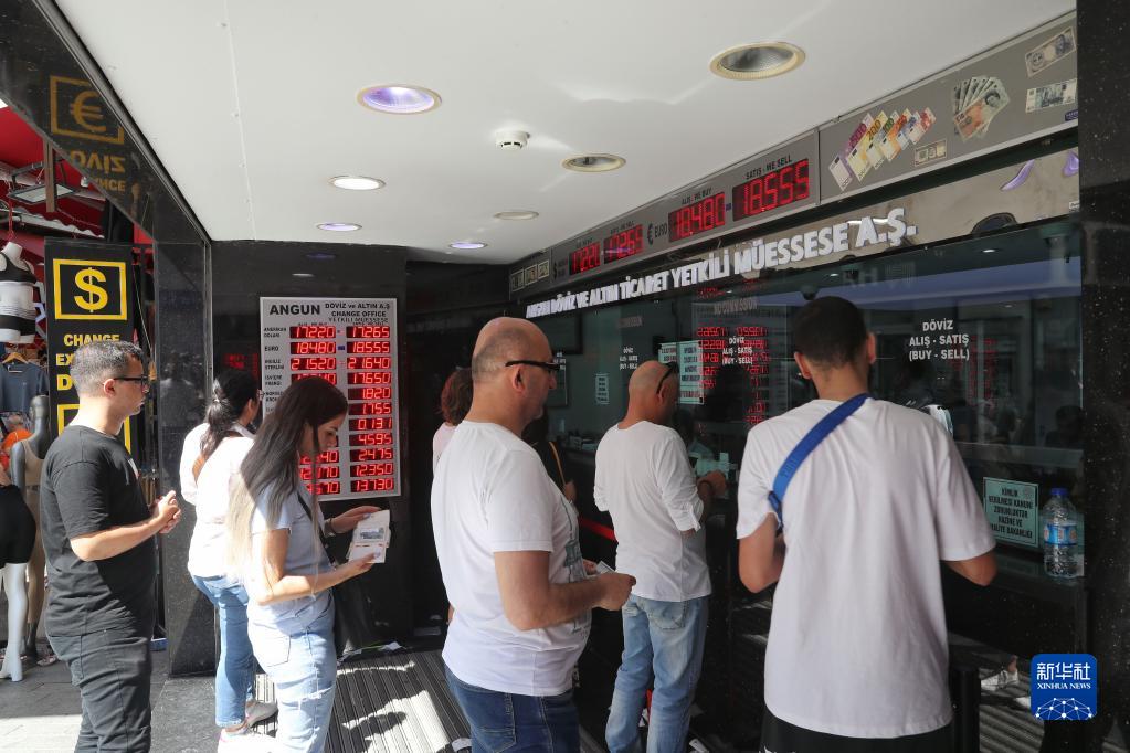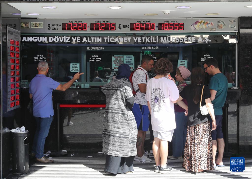 6月9日,在土耳其伊斯坦布尔,人们来到一处货币兑换点办理业务。新华社发(于纳尔·恰姆摄)